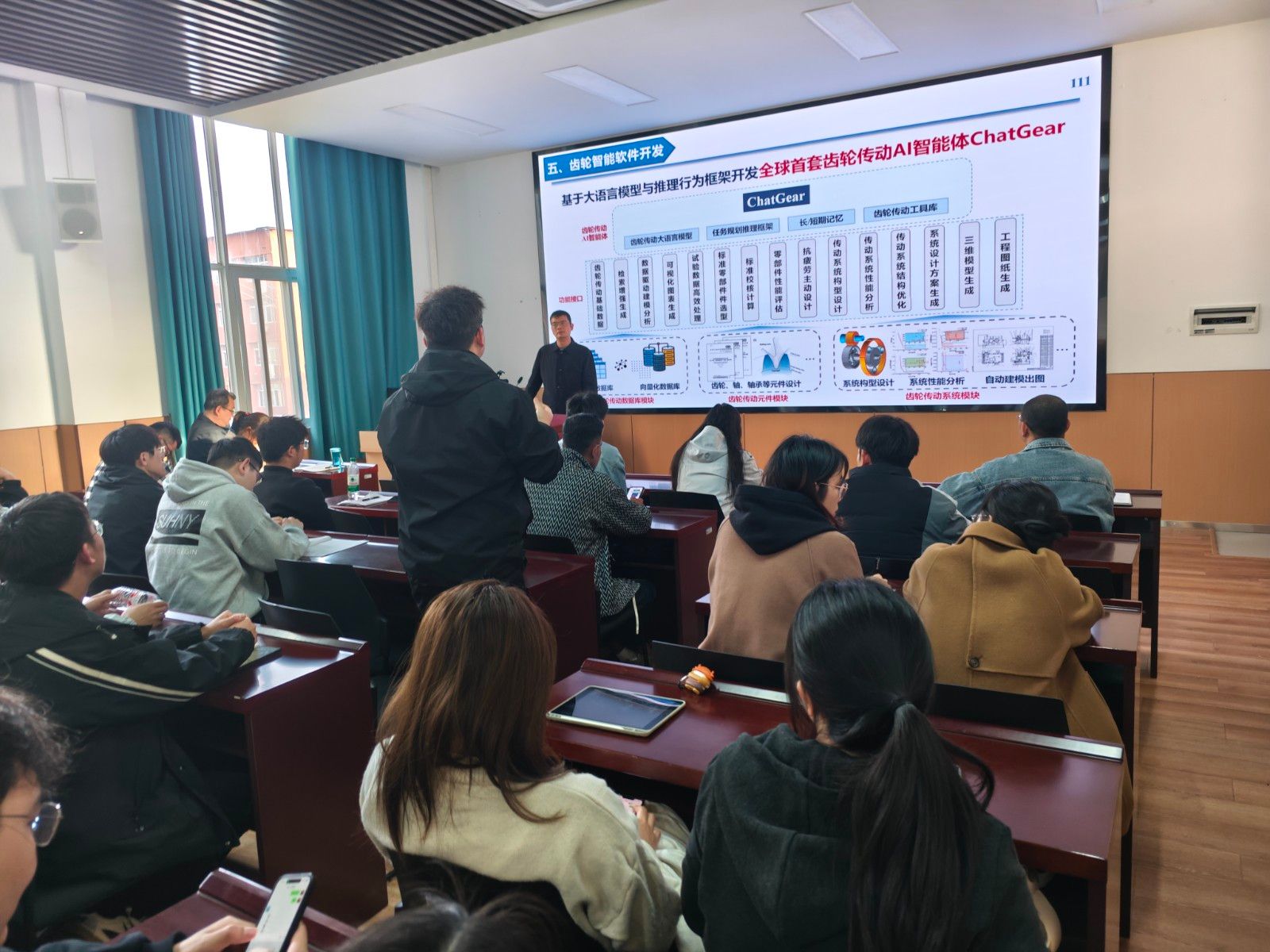 报告会上,刘怀举教授围绕高性能齿轮领域的关键科学问题与挑战,系统阐述了高性能齿轮基础数据建设、齿轮高承载主动设计方法、齿轮传动高功率密度设计、齿轮传动智能软件开发等方面的最新研究成果。刘怀举教授结合自身回国后的科研历程,从自身成长经验出发,深入浅出地分享了研究进展与实践感悟。报告内容兼具学理深度与实践价值,受到与会师生的高度评价。