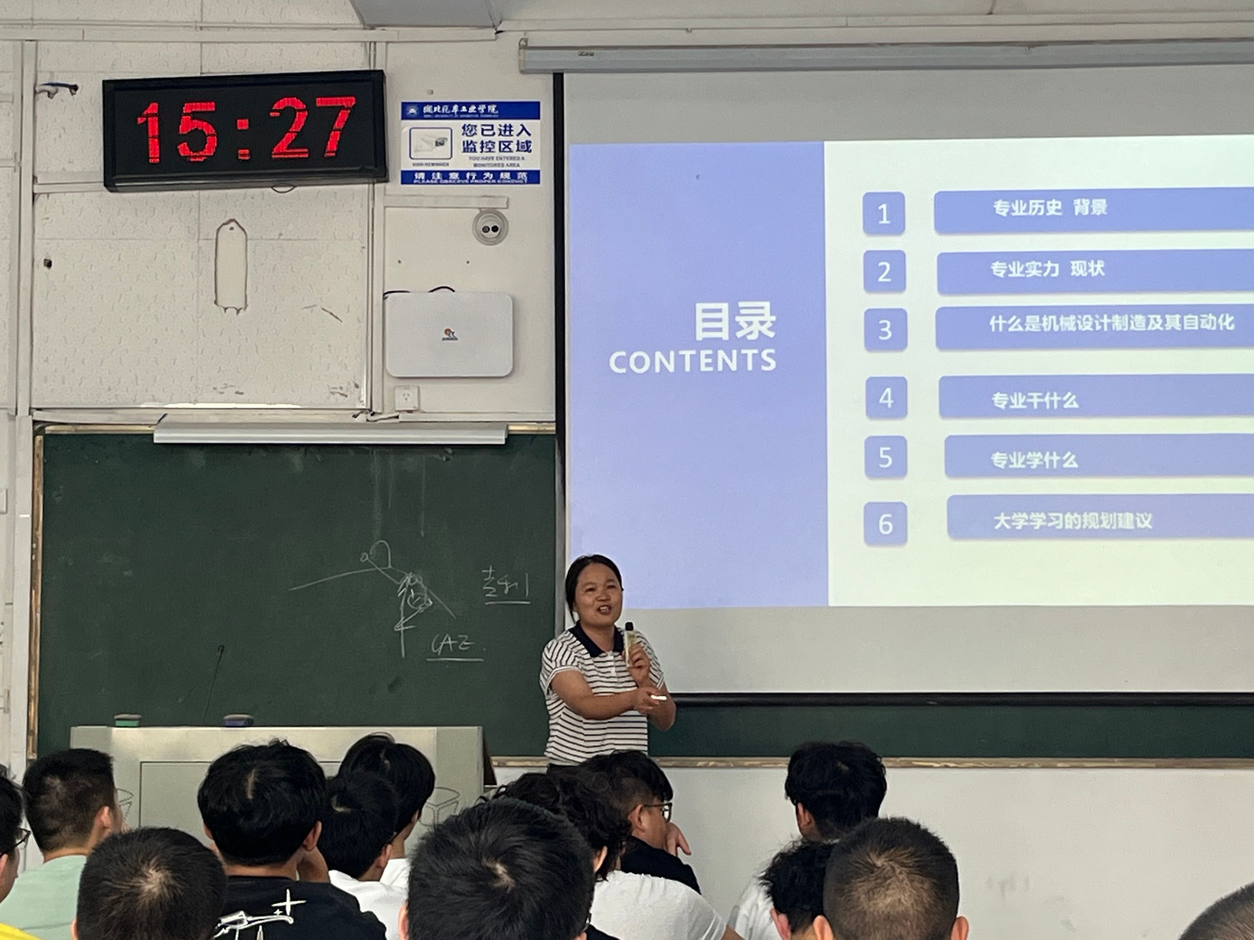 袁海兵和杨海如详细讲解机制专业的历史沿革、学科实力、师资队伍、学科发展前景,并重点展示智能车、智能机器人等学生科创获奖作品,让新生直观感受“工科王牌专业”的学科魅力。张伟详细解读测控专业人才培养方案,对专业建设、培养目标、课程设置、实习实践、毕业要求、就业升学等方面作了深入讲解,帮助新生了解专业发展动态及专业的特色优势和就业前景。王永泉主要从智能制造工程专业办学情况简介、专业介绍、专业发展前景、师资队伍与教学条件和专业学习方法及要求等方面讲解,并对新生们提出专业学习的注意事项,希望同学们尽快掌握专业学习方法,提高自身综合素质和竞争能力。侯俊凭借扎实的专业功底与丰富的行业经验,从工业工程专业核心知识、技能框架到职业发展路径,为新生们带来了一场“沉浸式”专业讲解。