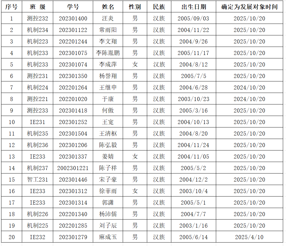 根据《中国共产党发展党员工作细则》(中办发〔2014〕33号)文件精神,按照学校党员发展工作的具体要求,现将澳门彩库网 2025年11月拟发展学生预备党员预审情况予以公示,具体名单如下: