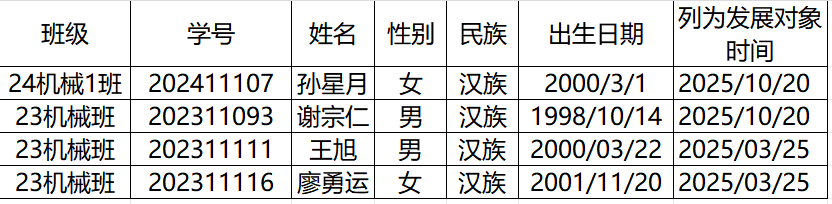 根据《中国共产党发展党员工作细则》(中办发〔2014〕33号)文件精神,按照学校党员发展工作的具体要求,现将澳门彩库网 2025年11月拟发展学生预备党员预审情况予以公示,具体名单如下: